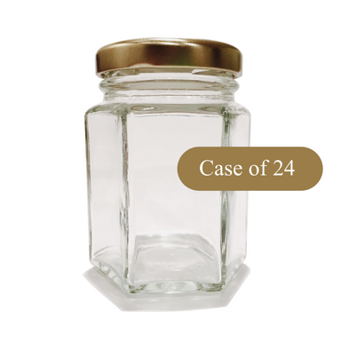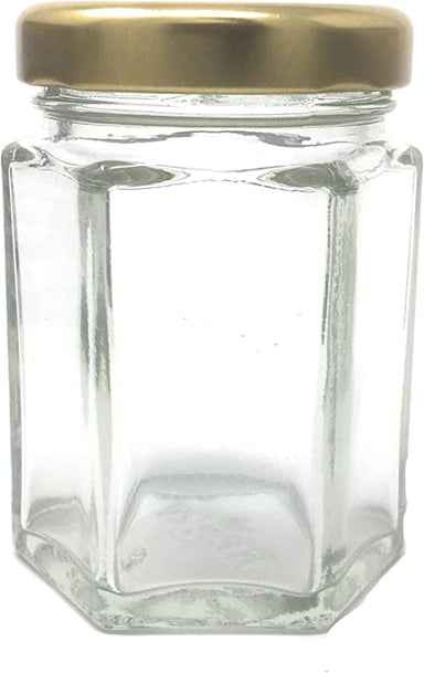 3.7 oz Clear Glass Hexagon Jars (Gold Lug Cap) Clear Glass Hexagon Jars are stylish containers, perfect for giving your jellies, jams, candies, mus...