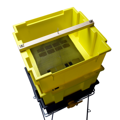 3-Tub uncapping unit with two coarse strainers, honey gate (in the bottom black tub, the color of the honey gate may vary from the photo) and stand...